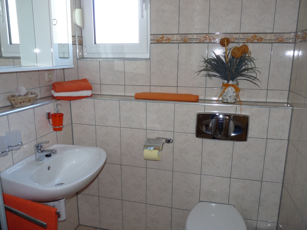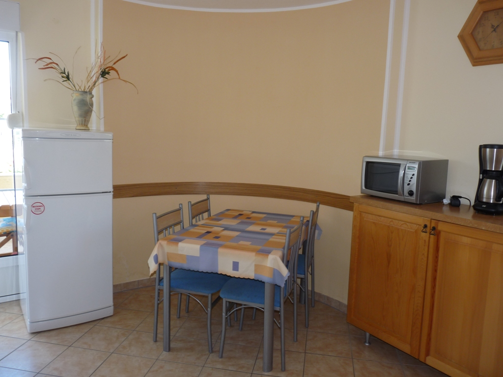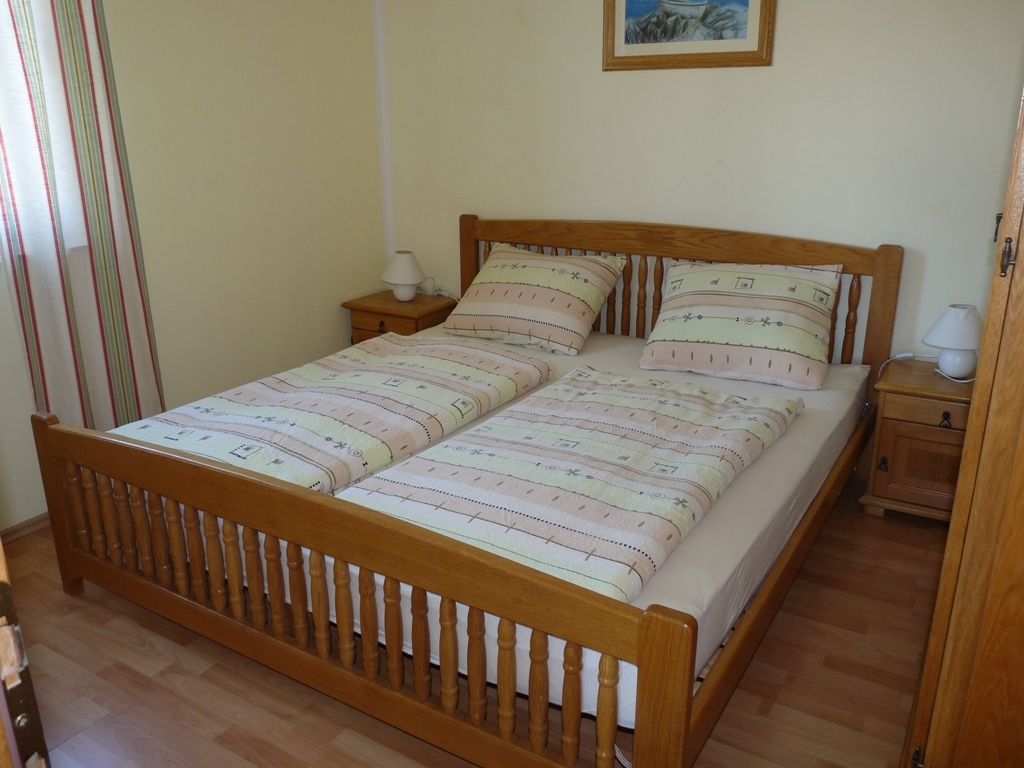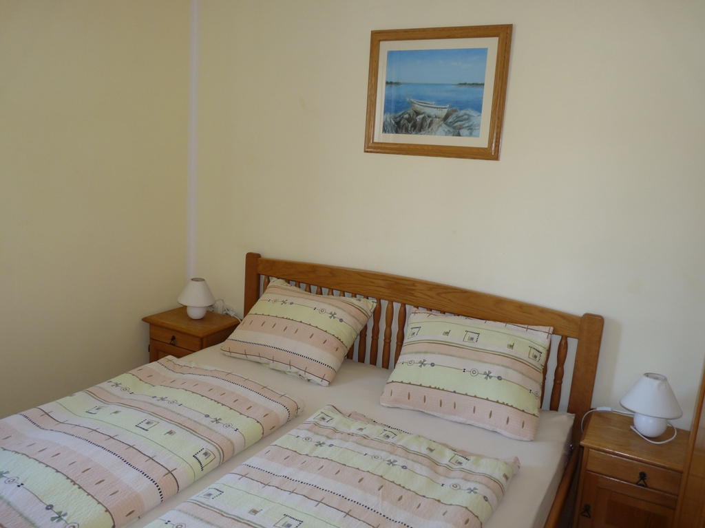 Schlafzimmer mit Doppelbett, Küche mit Essbereich und Wohnzimmer mit Schlafsofa, Badezimmer mit WC, Balkon, Klimaanlage, TV, WLAN, Grillmöglichkeit im Freien, Parkplatz