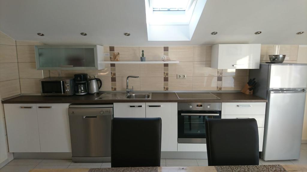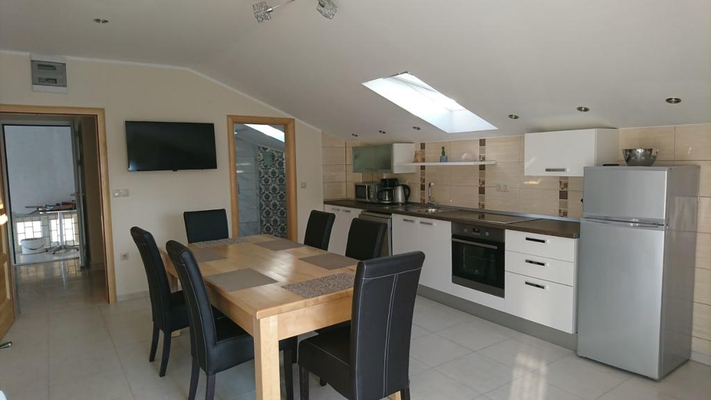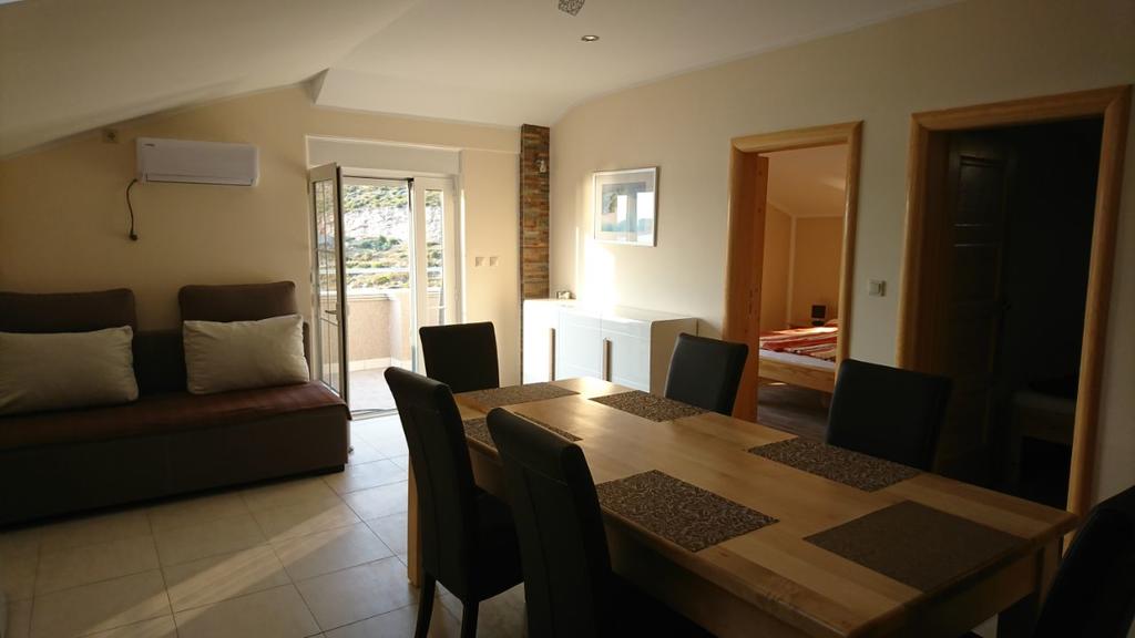 Zwei Schlafzimmer, eins mit Doppelbett und das andere mit zwei Einzelbetten; Wohnzimmer mit Zusatzbett für zwei Personen, Küche mit Esszimmer, Badezimmer mit WC, großer Balkon, Klimaanlage, TV, Wi-Fi, Grillzubehör im Freien, Parkplatz