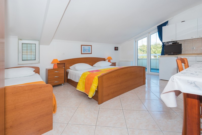 Studio 12 type 2+1 is located on the third floor and consists of a double bed and a single bed, a kitchen, a bathroom and a balcony with the sea view. The kitchen is equipped with cooking utensils and crockery.