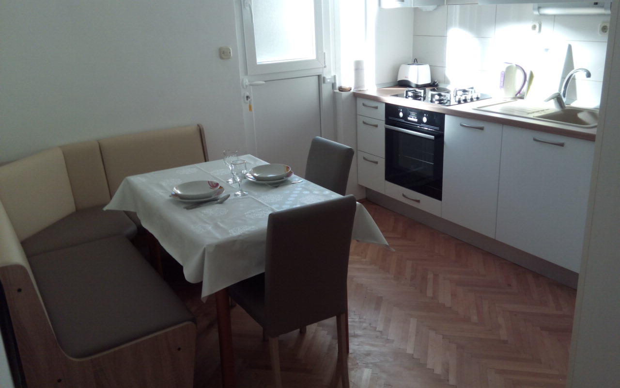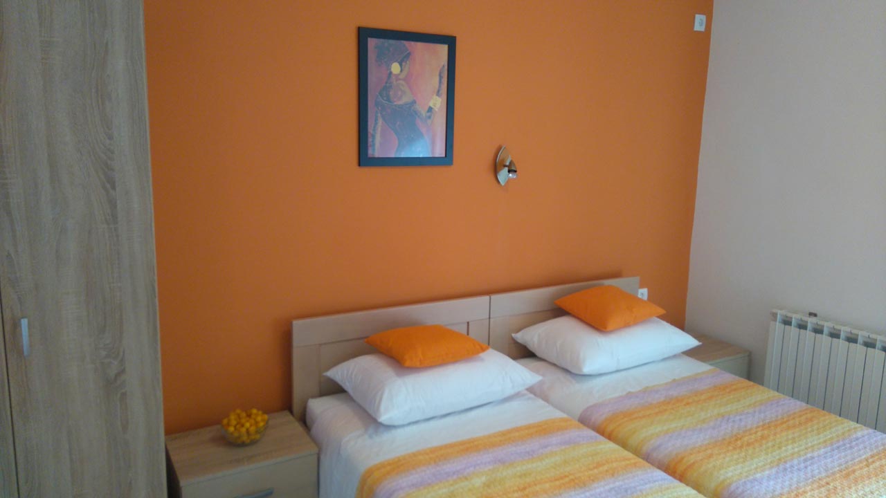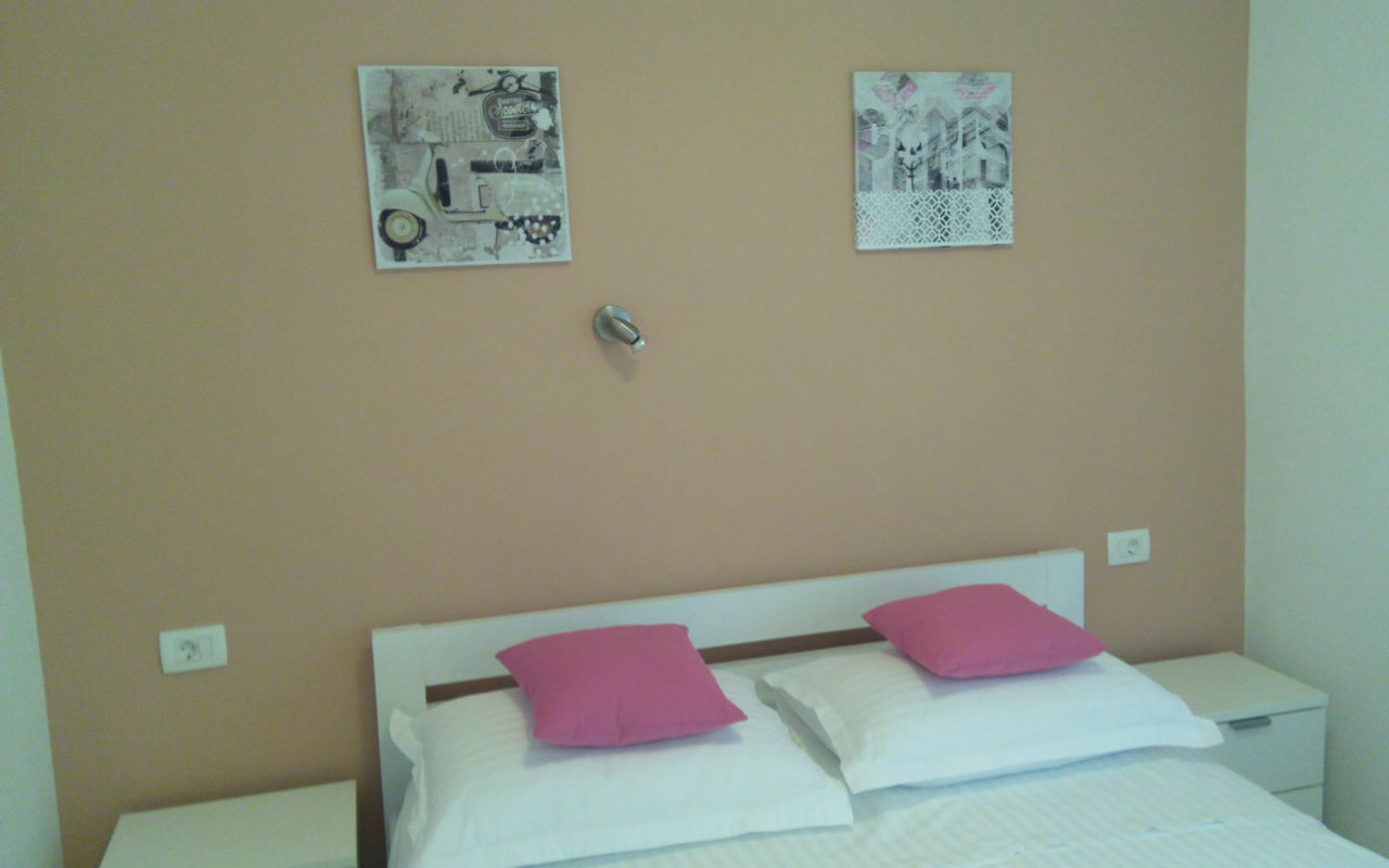Two separate bedrooms with double beds, living room with sofa bed, kitchen with dining area, bathroom with toilet, two balconies, air conditioning, TV, WiFi, ground floor, parking
