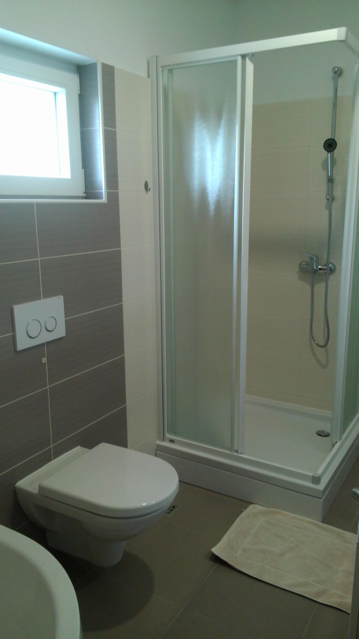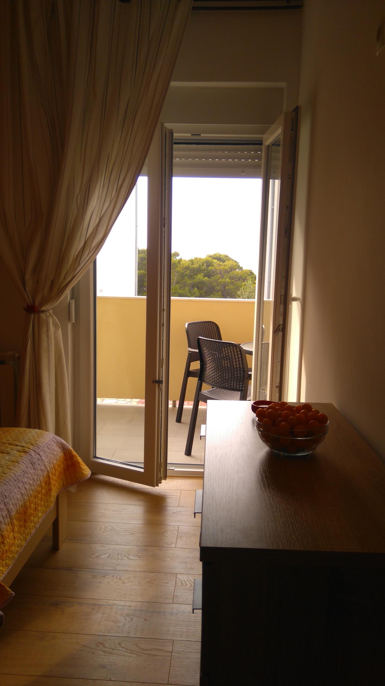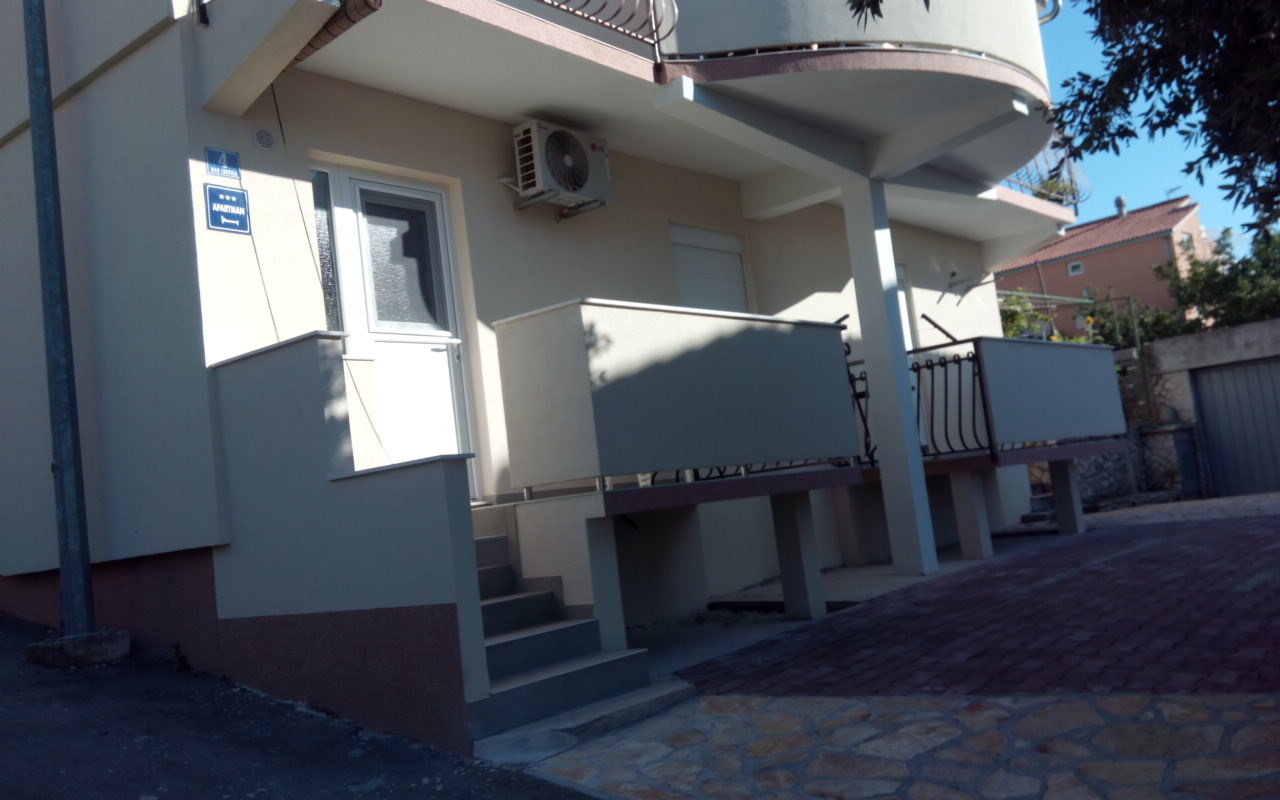 Two separate bedrooms with double beds, living room with sofa bed, kitchen with dining area, bathroom with toilet, two balconies, air conditioning, TV, WiFi, ground floor, parking