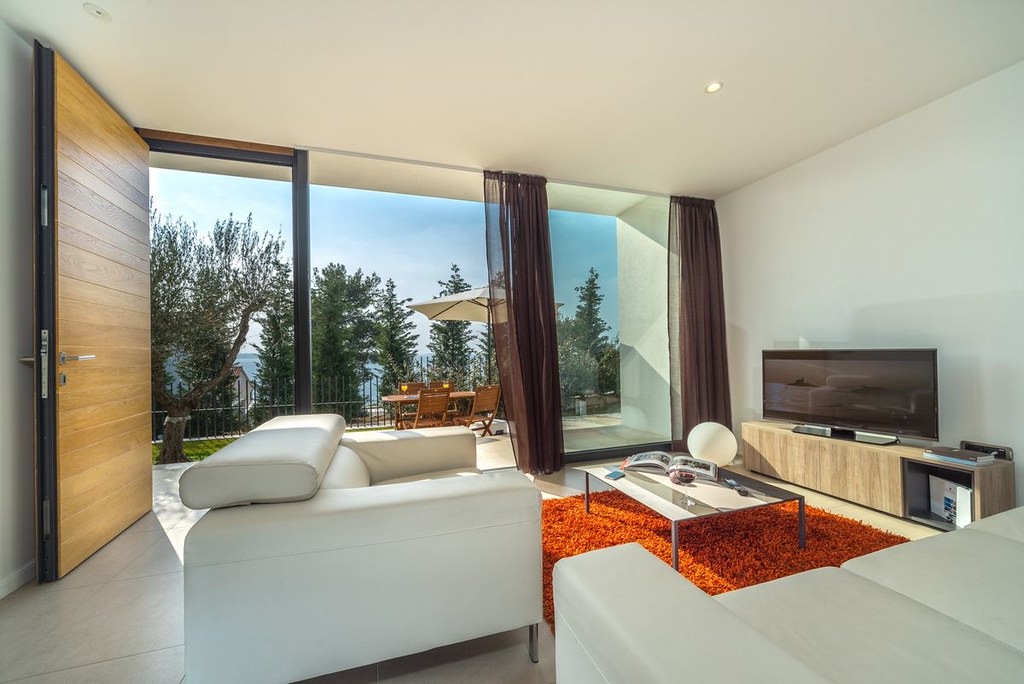 Séjour / salle à manger, TV SAT / LCD s'ouvre sur un jardin verdoyant d'olive (vue partielle sur la mer). Cuisine ouverte (plaque vitrocéramique 4 feux, four, congélateur, micro-ondes, lave-vaisselle, lave-linge). Deux salles de bain avec douche et WC.