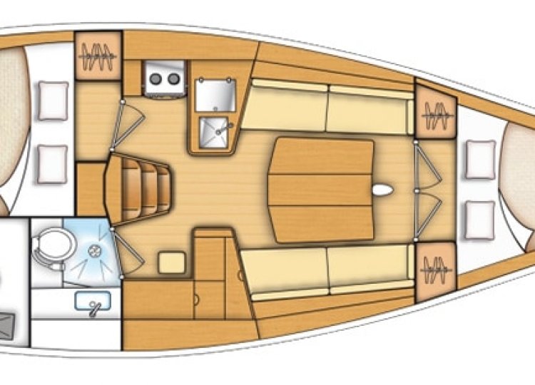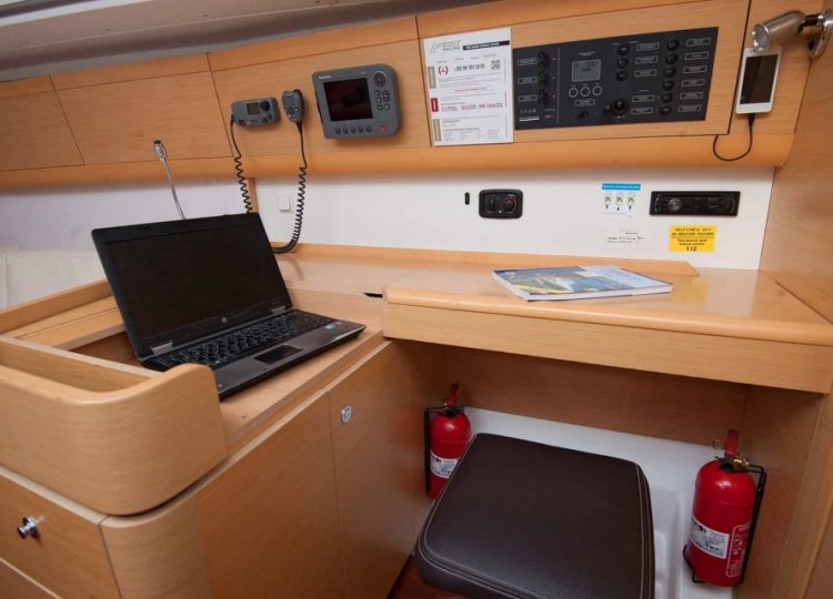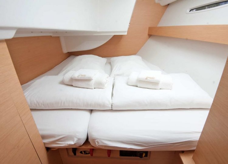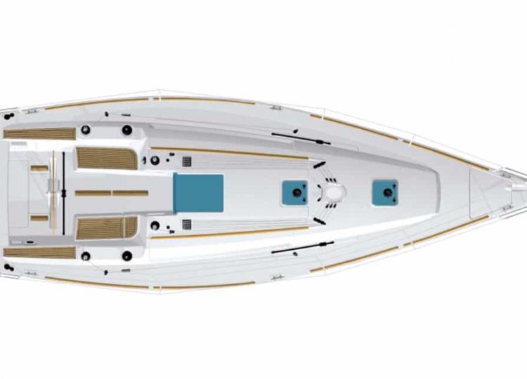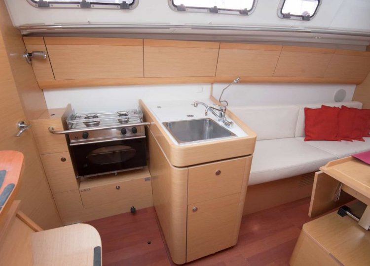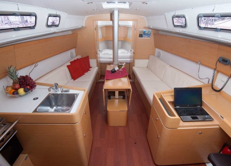Dvije kabine jedrilice s dva dodatna ležaja u salonu su pogodne za manje posade od 4 do 6 osoba. Kokpit impresionira svojim elegantnim dizajnom. Potpuno opremljena kuhinja sadrži plinski štednjak i pećnicu, te hladnjak od 120 litara koji radi na 12 V. Tuševi imaju automatske pumpe i, naravno, toplu vodu. Svaka kabina se samostalno grije.