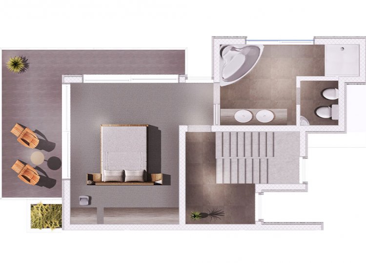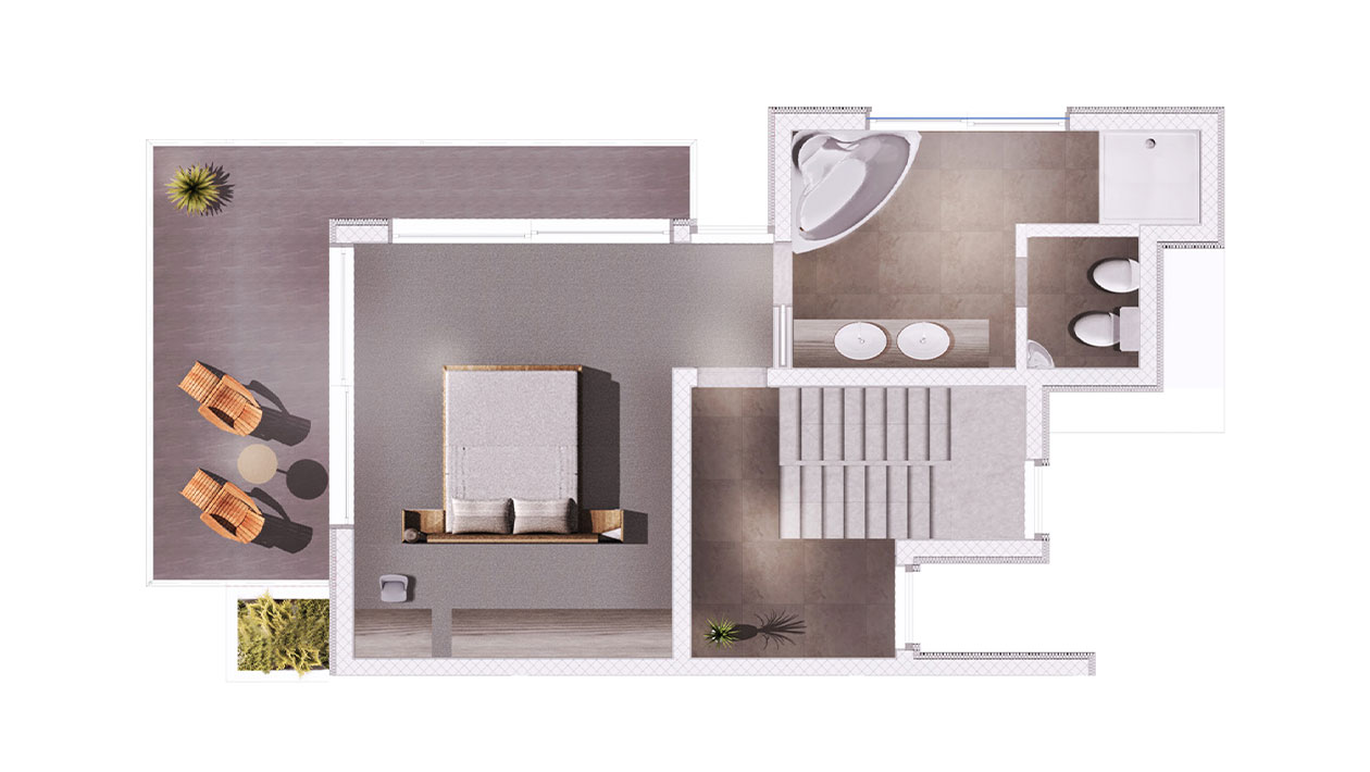 terasu. Na prvom katu se nalaze 2 spavaće sobe sa 2 sanitarna čvora (kupatilo i wc), a na drugom katu jedna spavaća soba