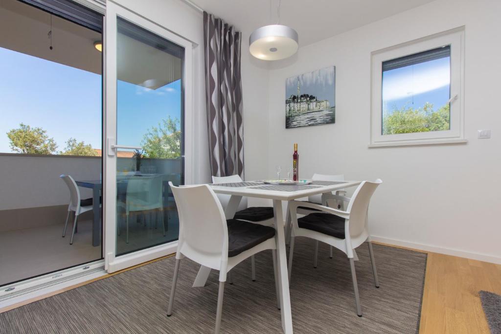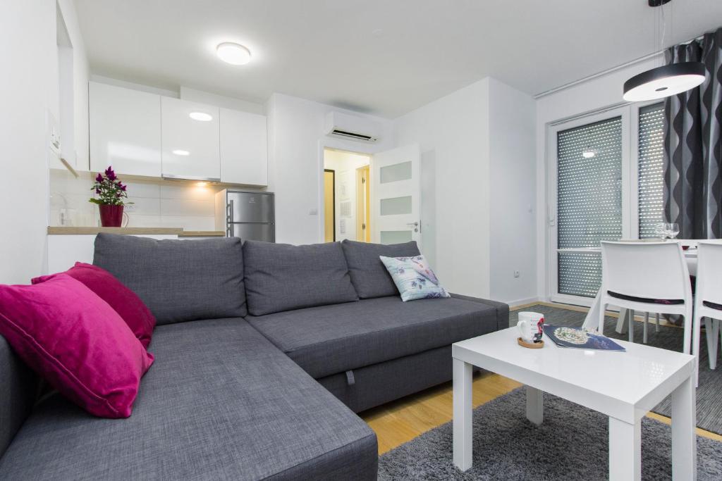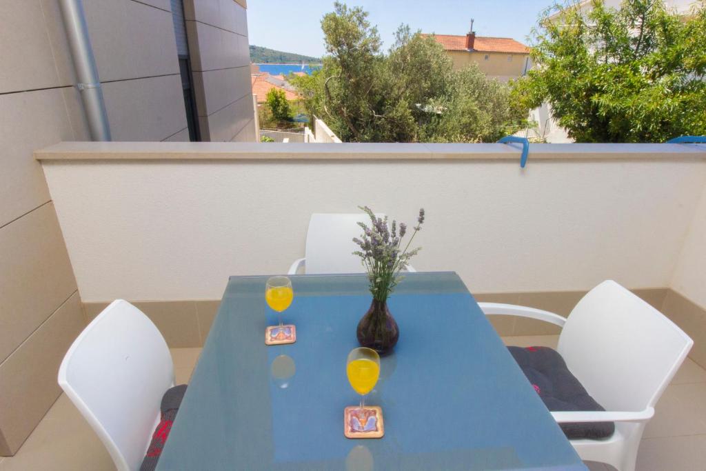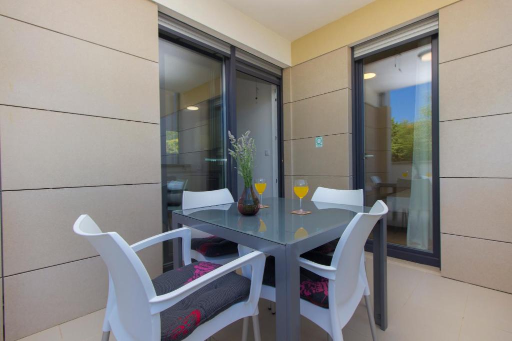 Ten apartament na parterze dysponuje balkonem z widokiem na ogród i morze. Obejmuje salon z rozkładaną sofą oraz kuchnię z jadalnią. W łazience znajduje się prysznic.