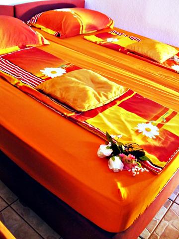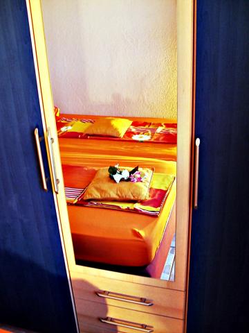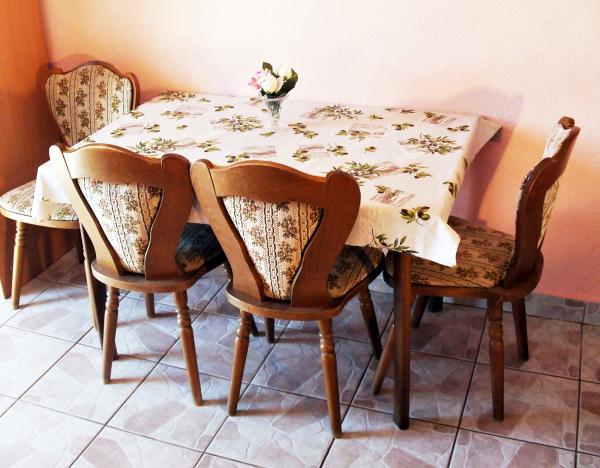 55m²; dwie sypialnie z podwójnymi łóżkami i dodatkowym łóżkiem, kuchnia z jadalnią, łazienka z toaletą, balkon, internet, parking