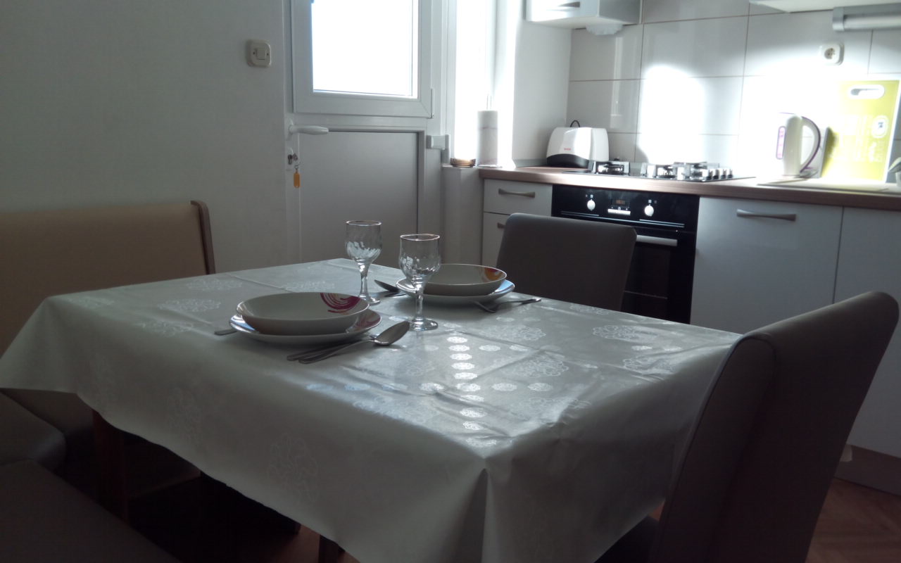 Zwei separate Schlafzimmer mit Doppelbetten, Wohnzimmer mit Schlafsofa, Küche mit Essbereich, Badezimmer mit WC, zwei Balkone, Klimaanlage, TV, WLAN, Erdgeschoss, Parkplatz