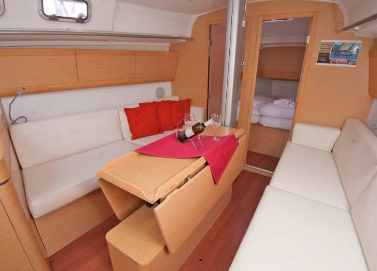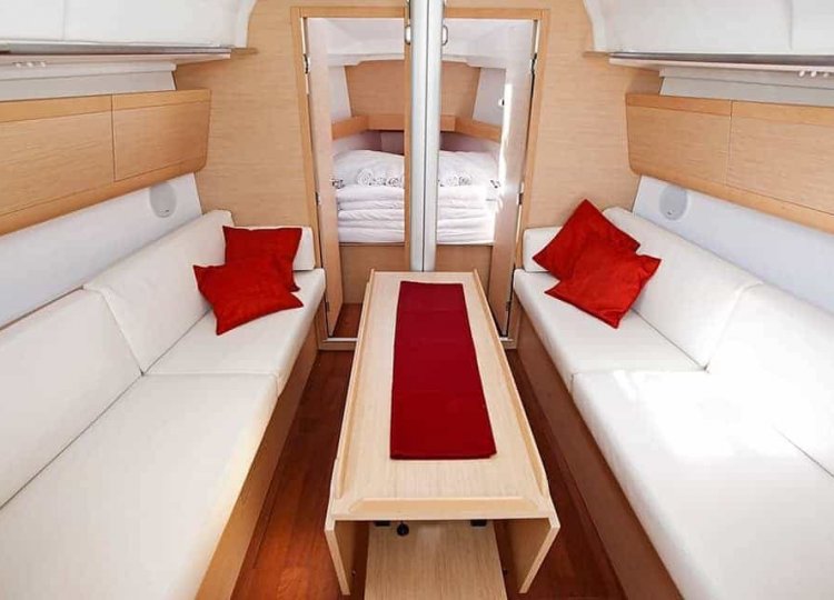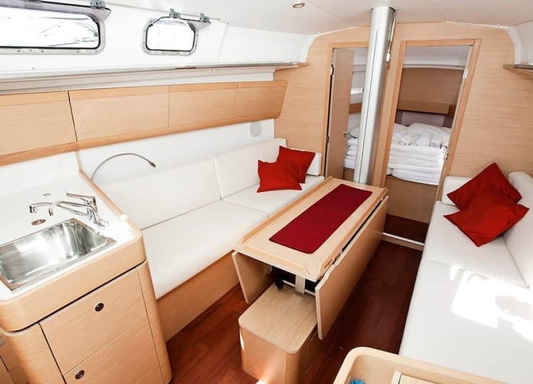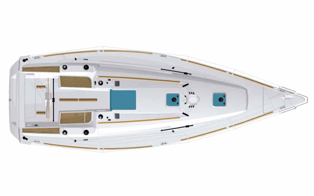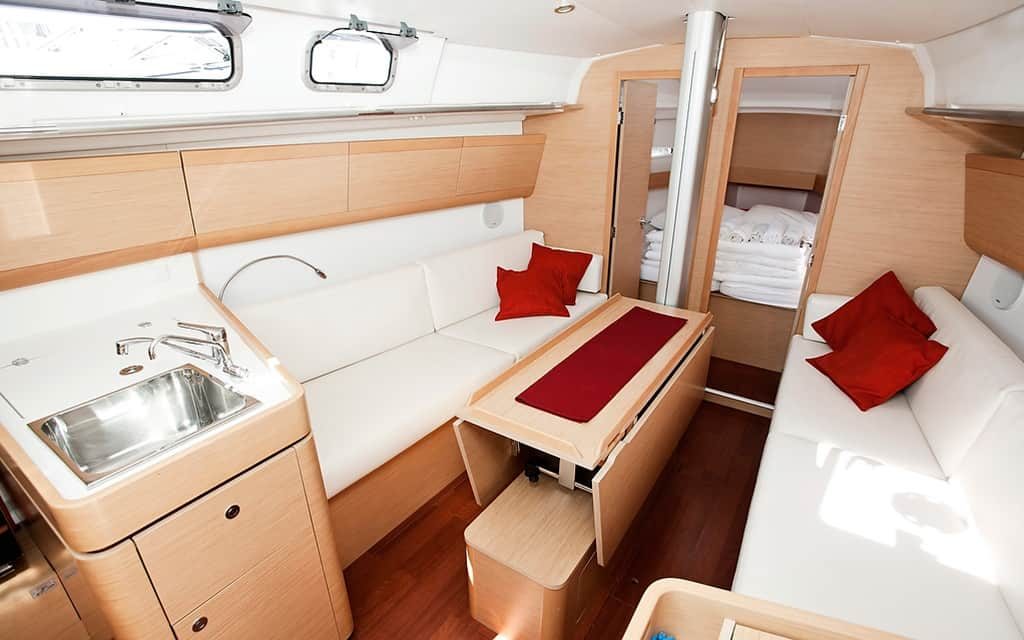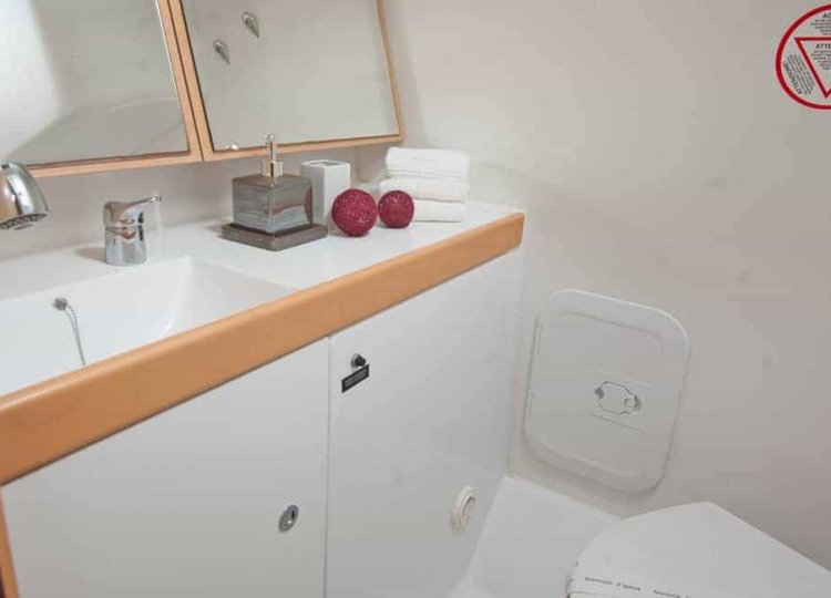 Zwei Segelbootkabinen mit zwei zusätzlichen Kojen im Salon eignen sich für kleinere Crews von 4 bis 6 Personen. Das Cockpit besticht durch sein elegantes Design. Die voll ausgestattete Küche enthält einen Gasherd und Backofen sowie einen 120-Liter-Kühlschrank mit 12 V. Die Duschen haben automatische Pumpen und natürlich heißes Wasser. Jede Kabine wird unabhängig beheizt.