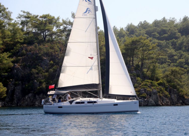 Ein ausgezeichnetes Segelboot zum einfachen Segeln, ausgestattet mit einem vollen Großsegel und einer selbstfahrenden Fock.