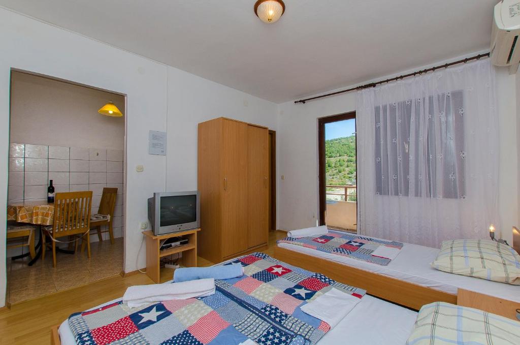 Studio d'environ 20m2 avec un balcon donnant sur le côté de l'immeuble.