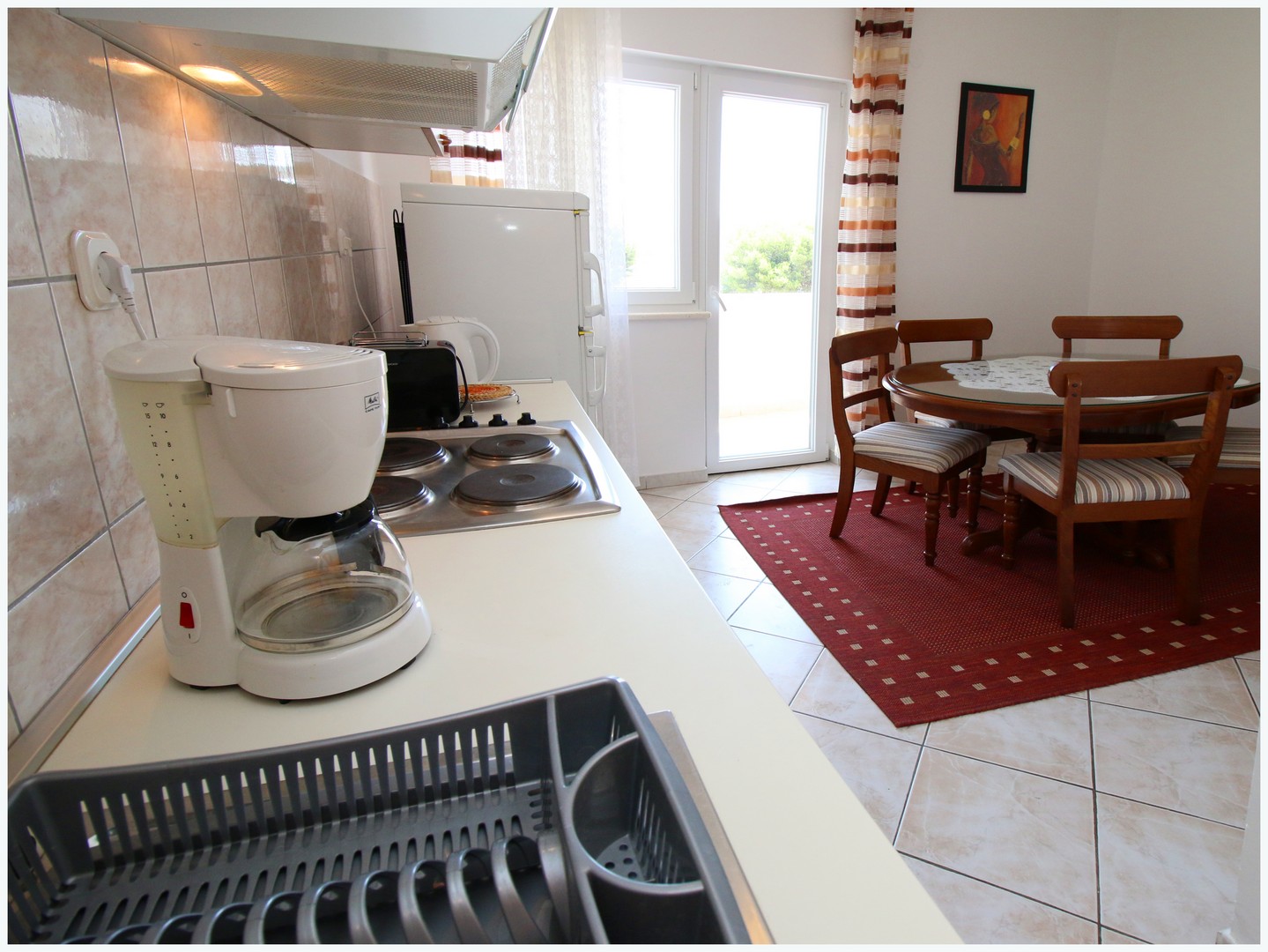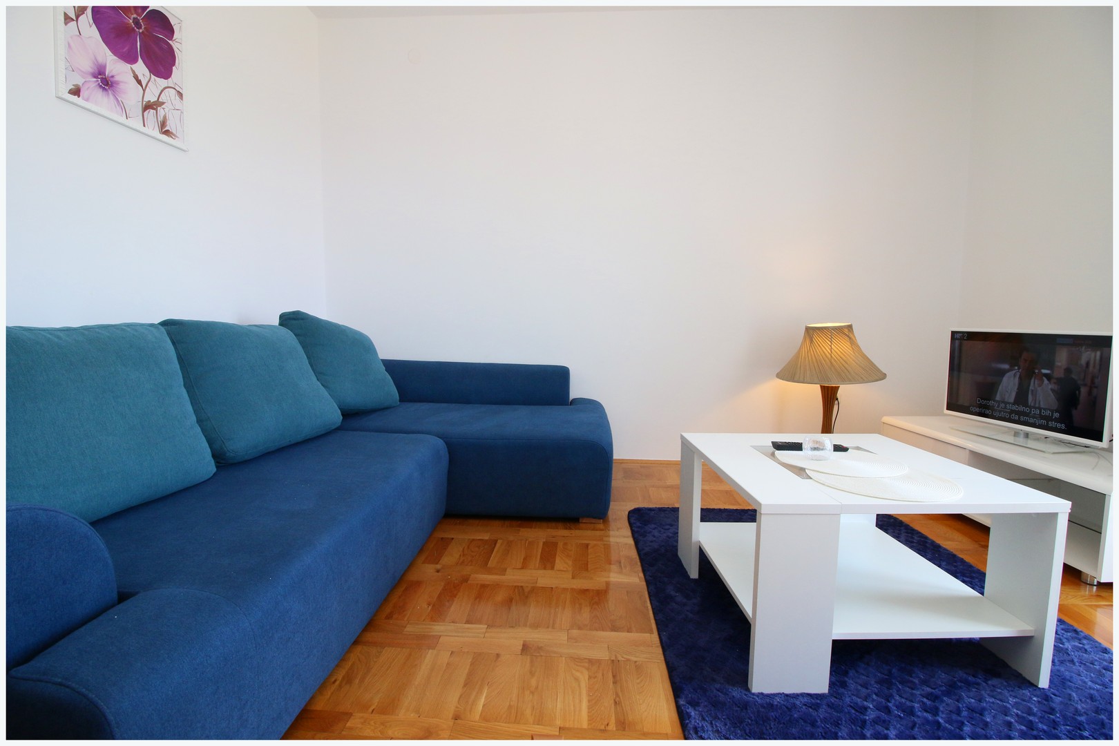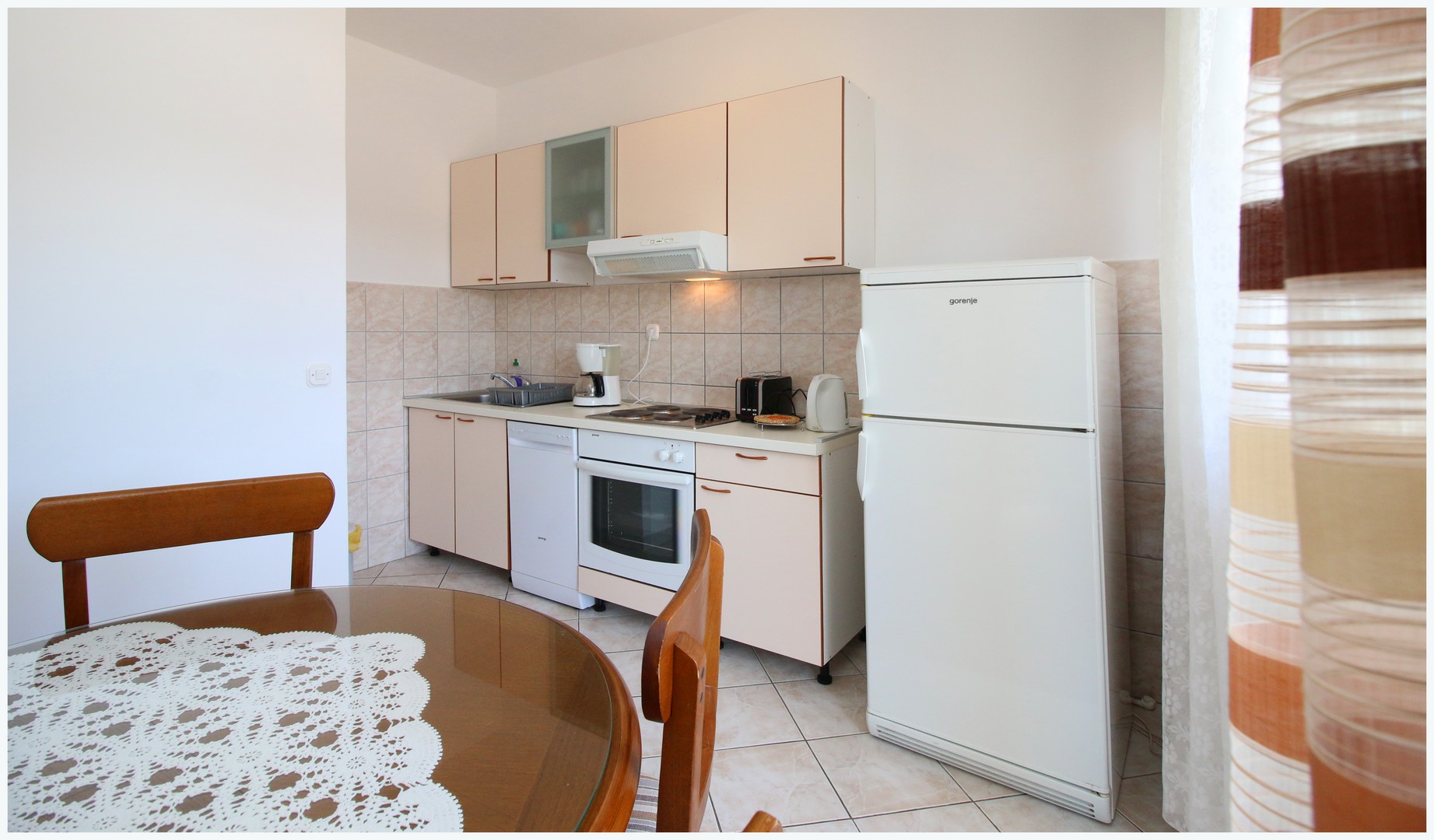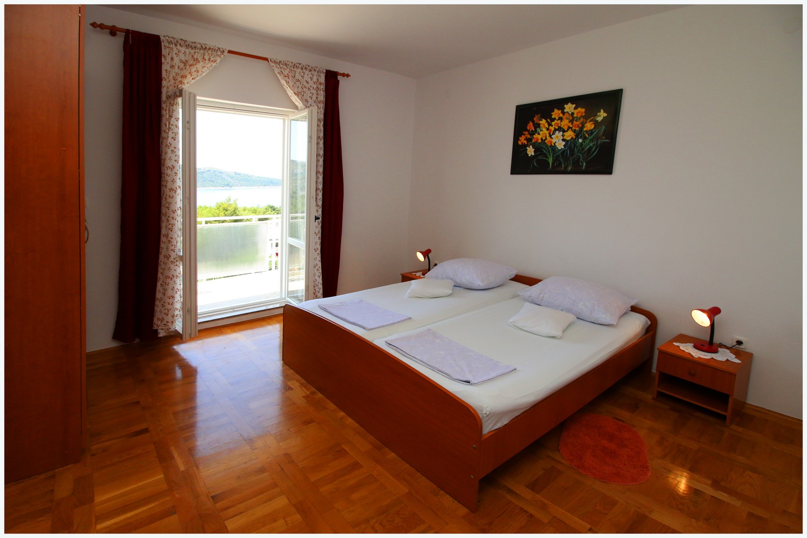 75 m²; deux chambres avec lits doubles, salon avec canapé-lit et lit simple, cuisine avec coin repas, deux salles de bain avec toilettes, balcon, climatisation, TV, WiFi, parking