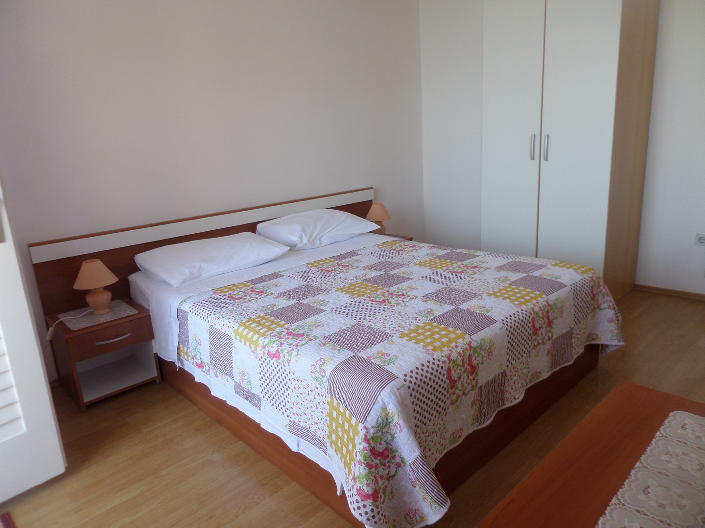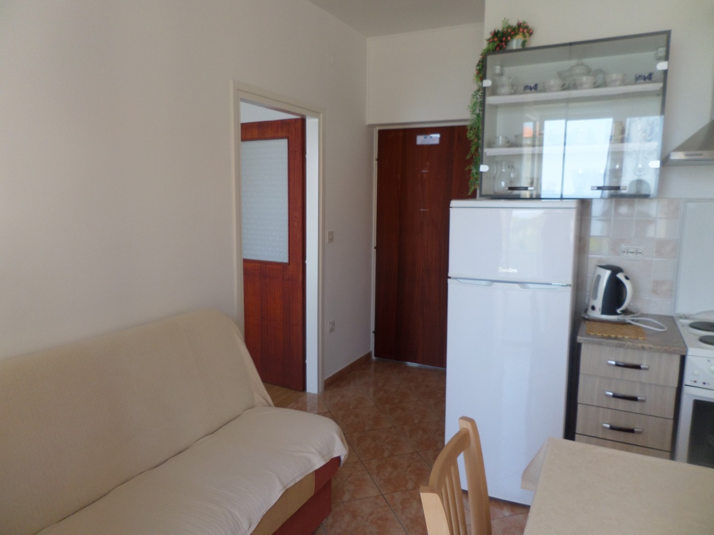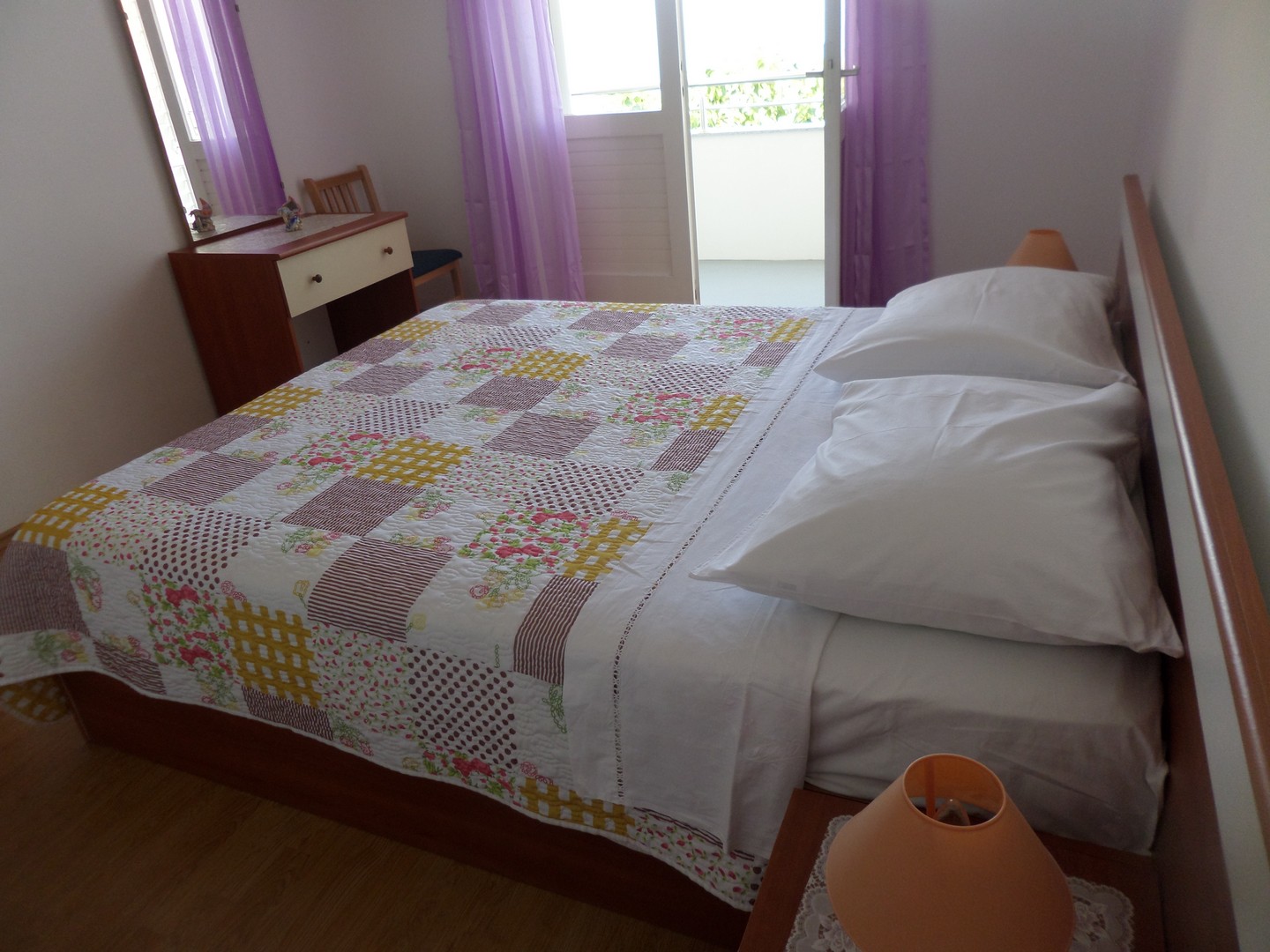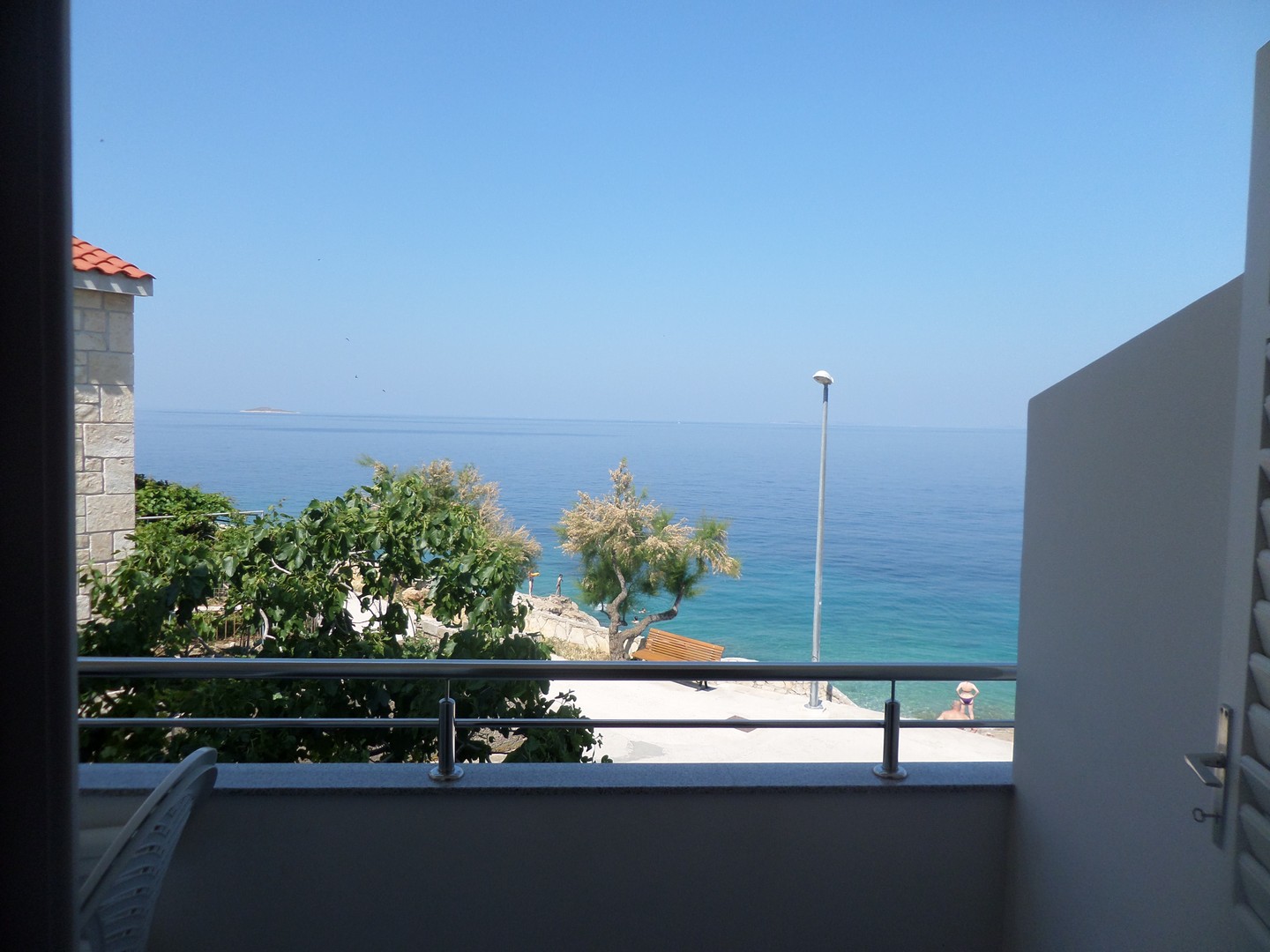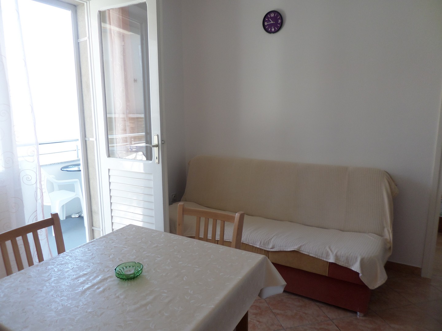 chambre à coucher avec lit double, canapé-lit dans le salon pour une personne (ou deux plus petites), salle de bains avec WC, TV satellite, cuisine, balcon avec vue sur la mer et la plage, parking, à 10 m de la mer et de la plage, 1er étage