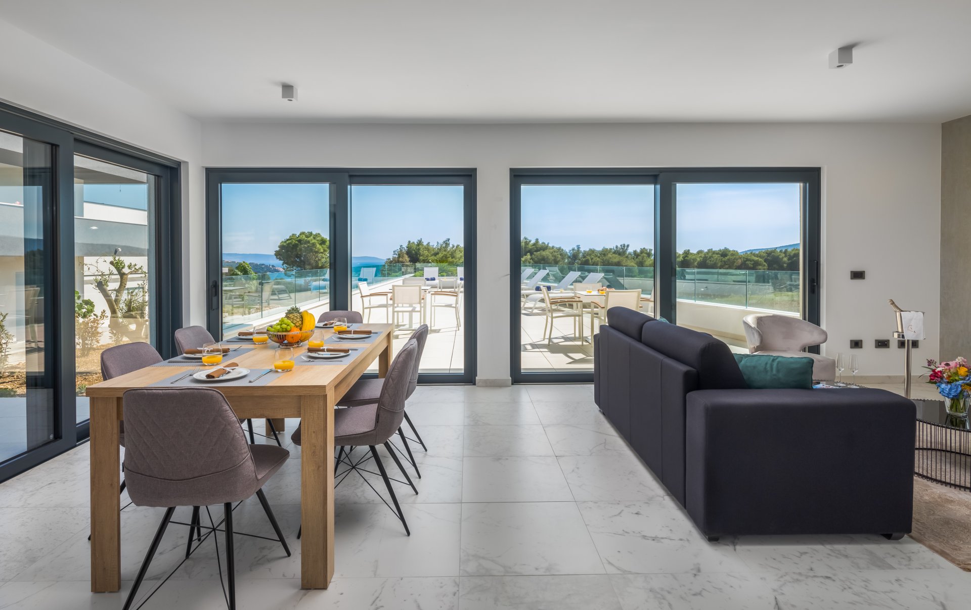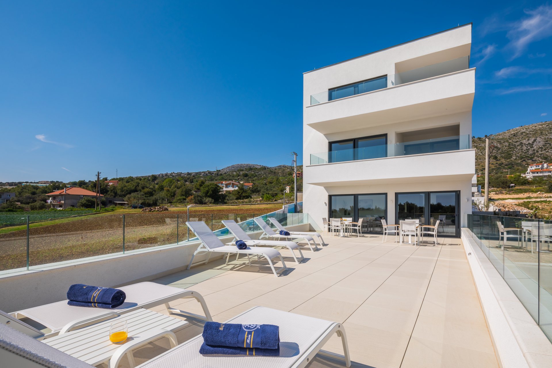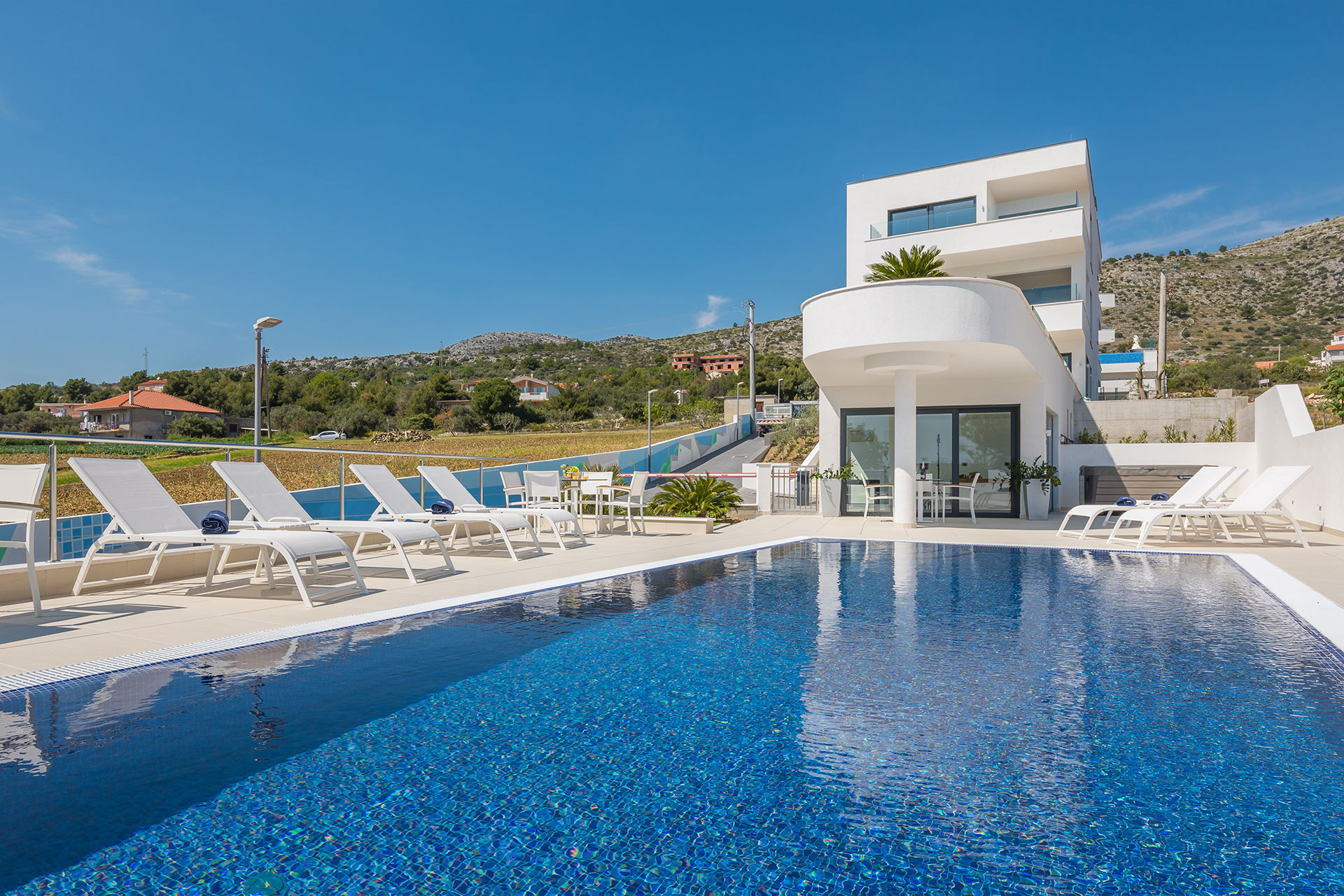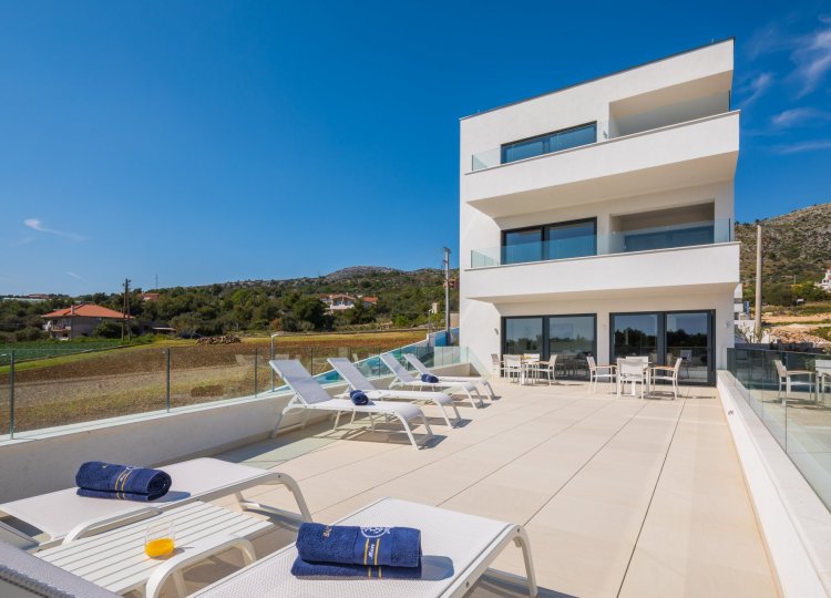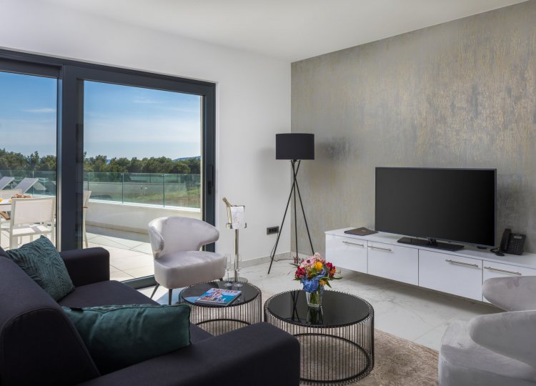 La villa est divisée en 3 appartements séparés, chacun avec accès séparé par ascenseur et utilisation partagée de la piscine extérieure.