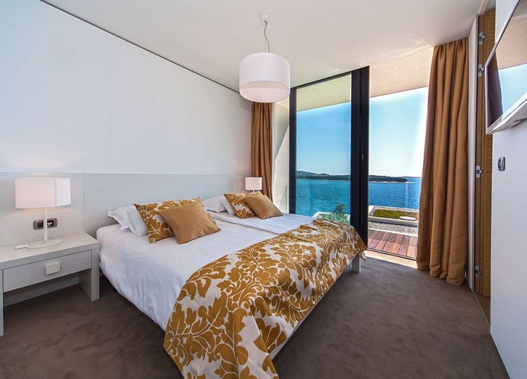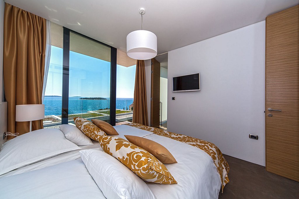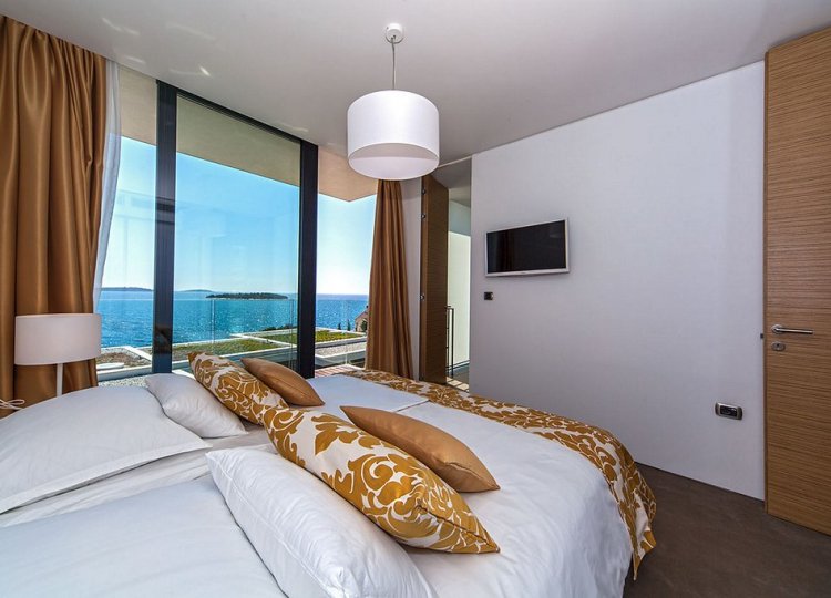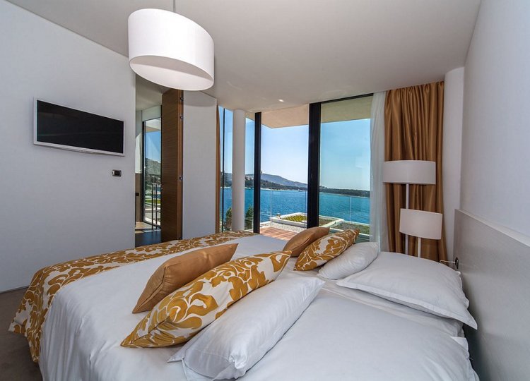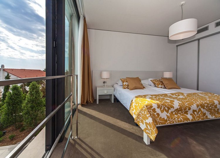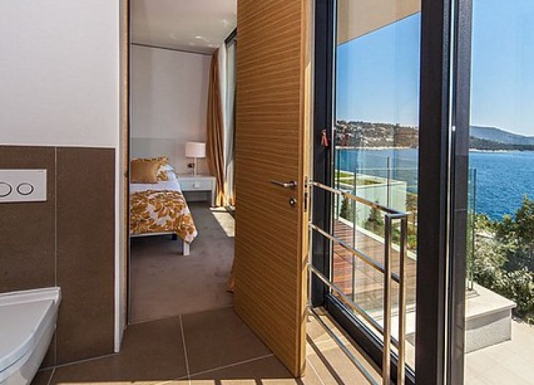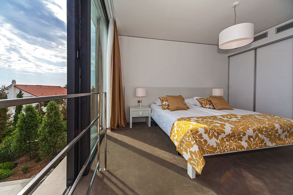 Prvi kat: 3 spavaće sobe s bračnim krevetom (2x90x200cm), SAT / LCD TV, kupaonica, izlaz na balkon (4 m2, prekrasan pogled na more; 1 spavaća soba s 2 kreveta (2x90x200 cm), SAT / LCD TV, en suite , francuski balkon.Krovni parking u vili za dva automobila.