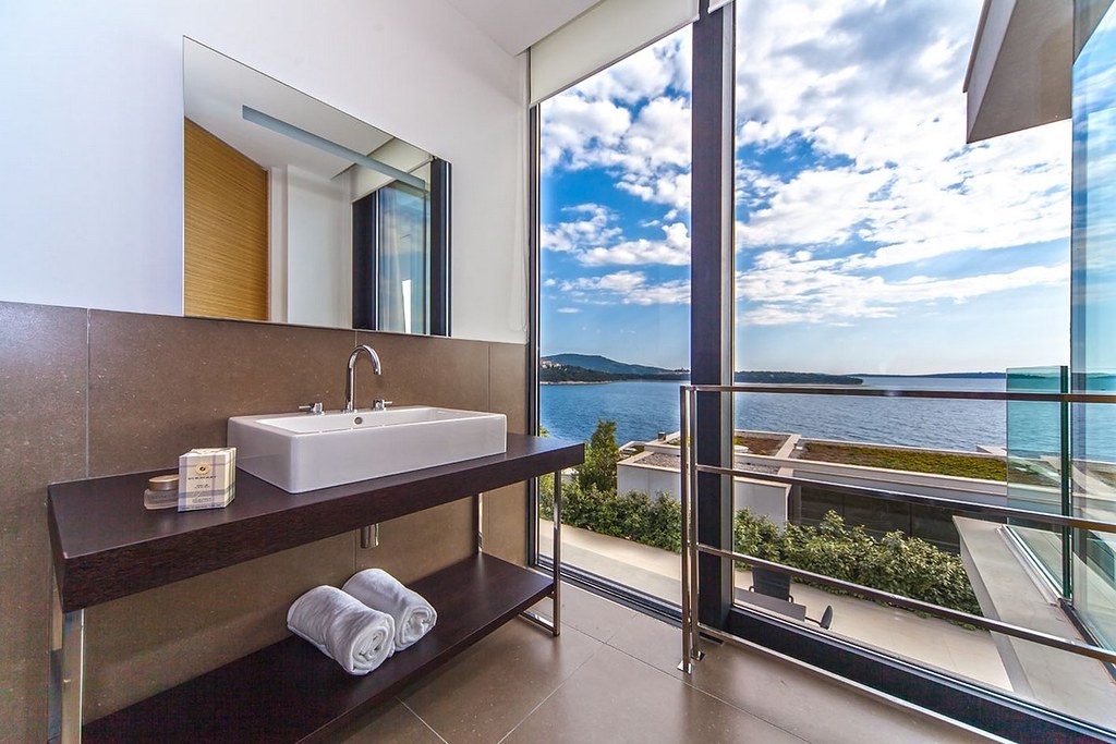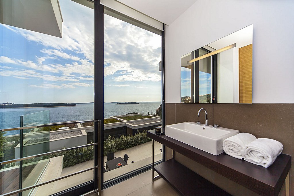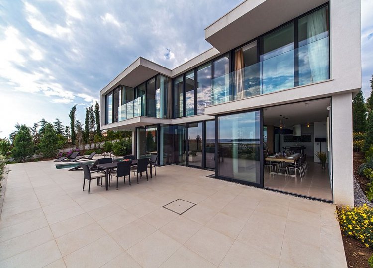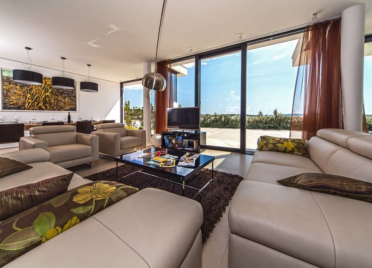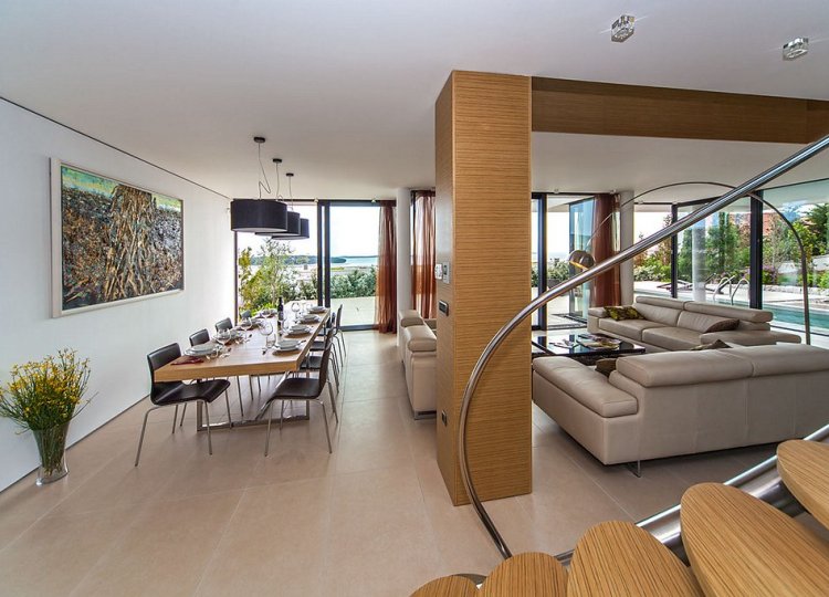 Prizemlje: veliki dnevni boravak, blagovaonica (105 m2), SAT / LCD TV, izlaz na terasu (82 m2, sjedeća garnitura, pogled na more). Otvorena kuhinja (štednjak s keramičkom plocom s četiri prstena, pećnicom, mikrovalnom pećnicom, zamrzivačem, perilicom posuđa). Odvojeni wc. Vanjski bazen, djelomično natkriven (22 m2, dubina 140 cm), sauna sa tušem. Oprema za fitness: bicikl u zatvorenom. Zatvoreno stubište.