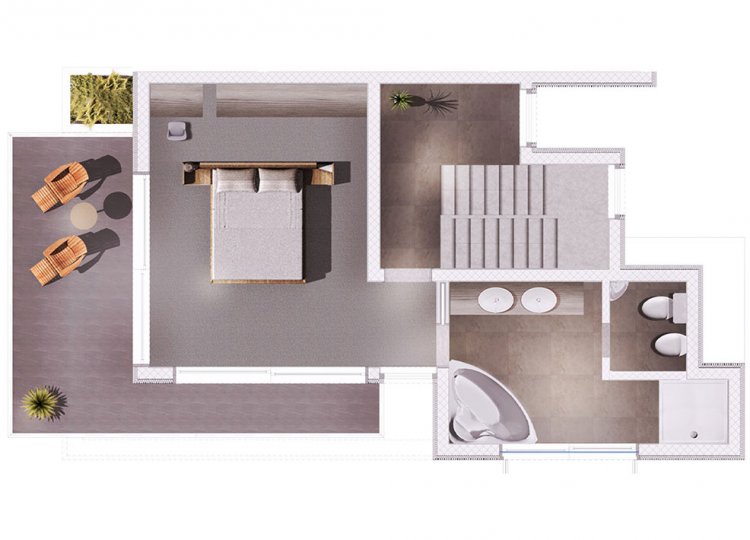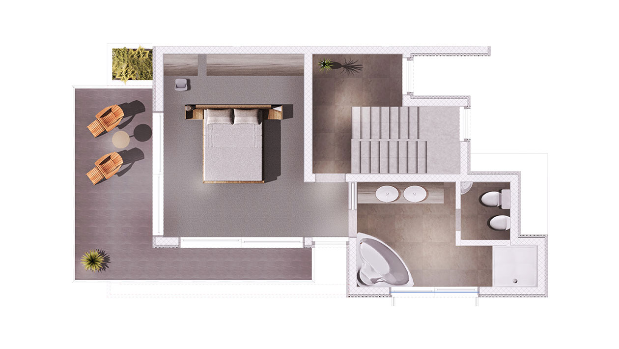 terasu. Na prvom katu se nalaze 2 spavaće sobe sa 2 sanitarna čvora (kupatilo i wc), a na drugom katu jedna spavaća soba