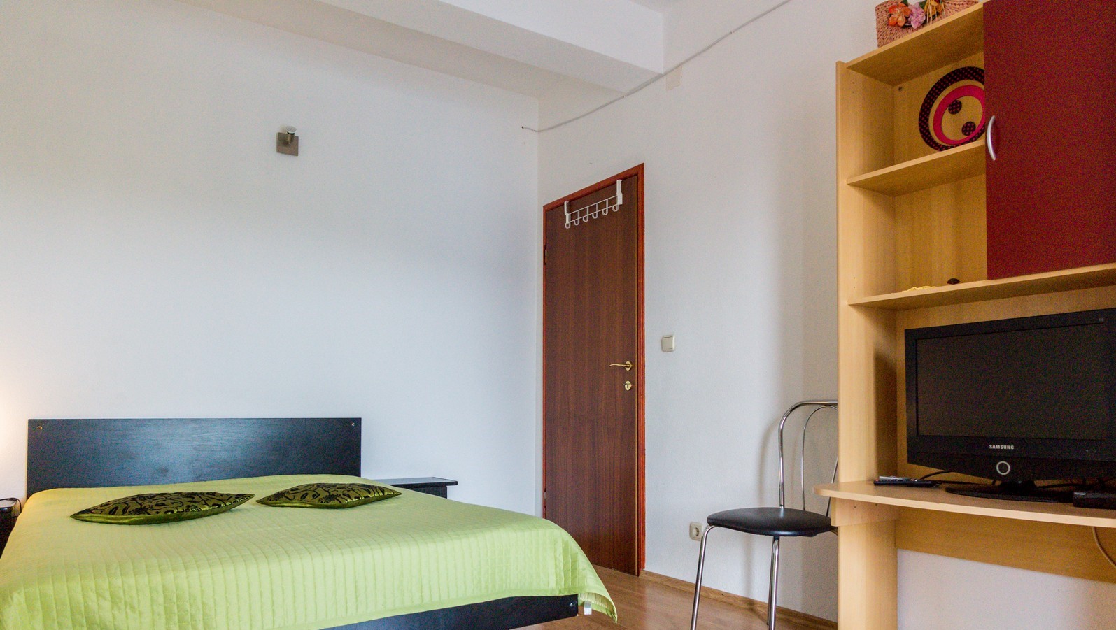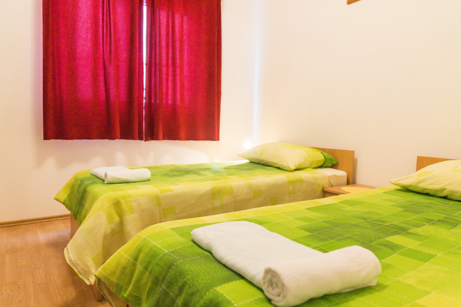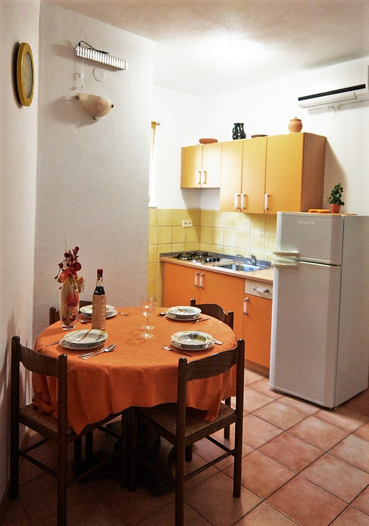 65m2; due camere da letto, la prima delle quali ha un letto matrimoniale e un divano letto, e la seconda camera ha due letti singoli; Cucina con sala da pranzo, bagno con WC, balcone con vista sul mare (l'uscita dal balcone è possibile solo dalla prima camera da letto), aria condizionata, TV satellitare, Wi-Fi, primo piano, parcheggio
