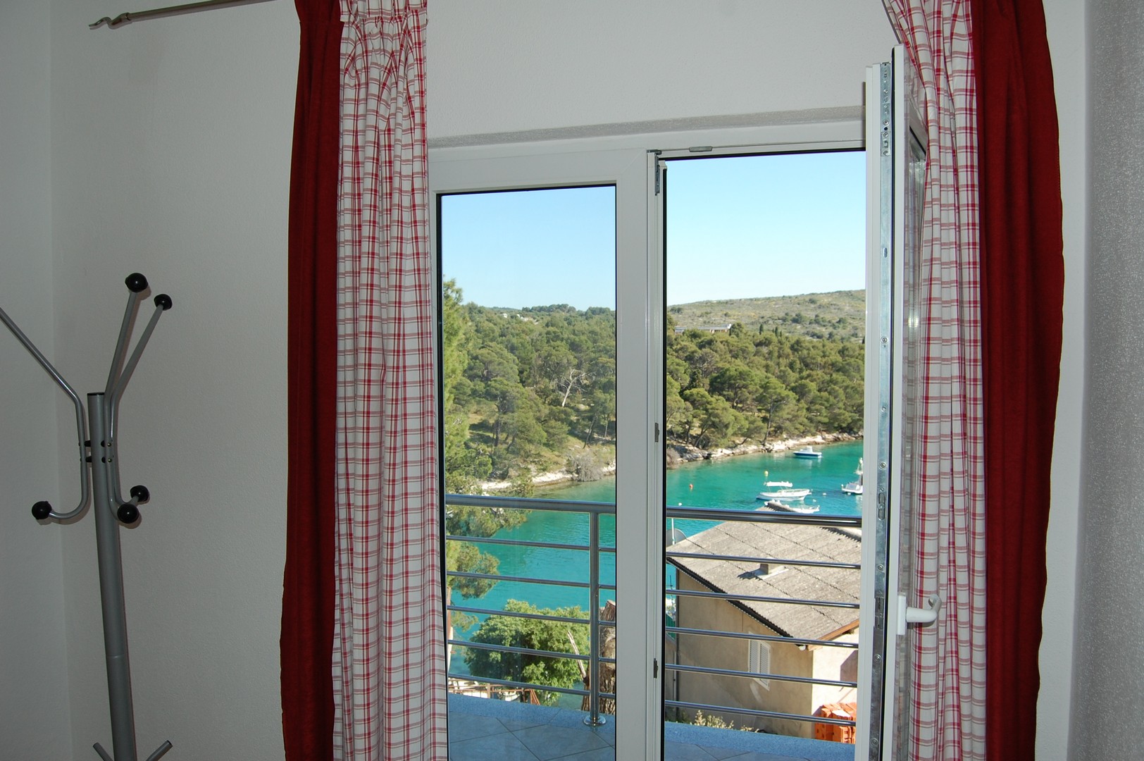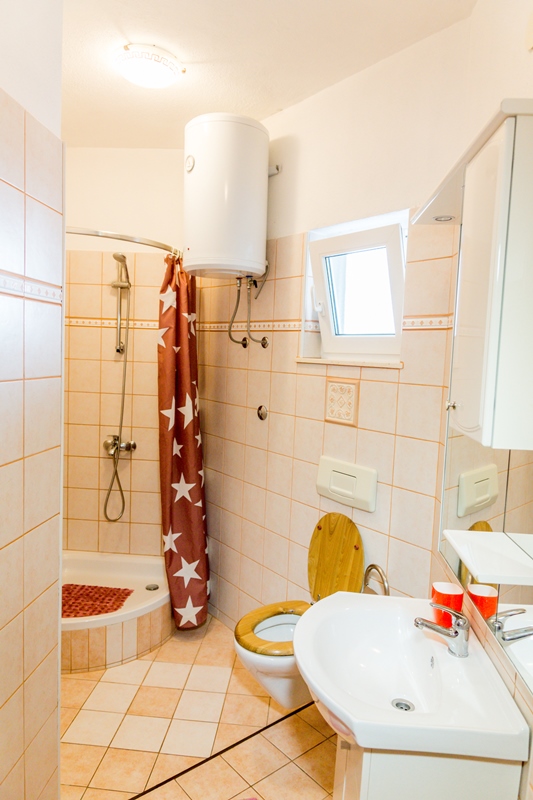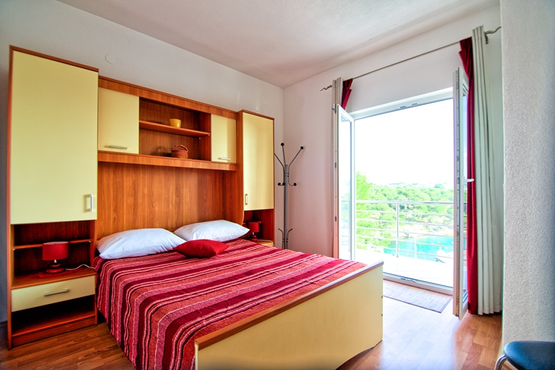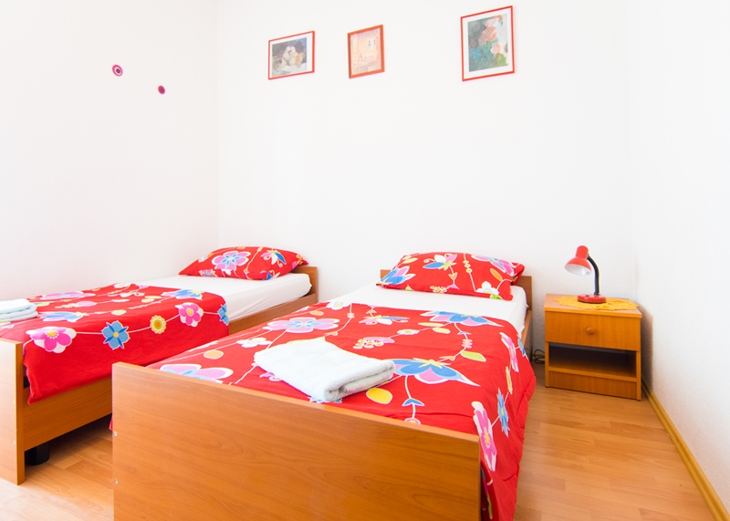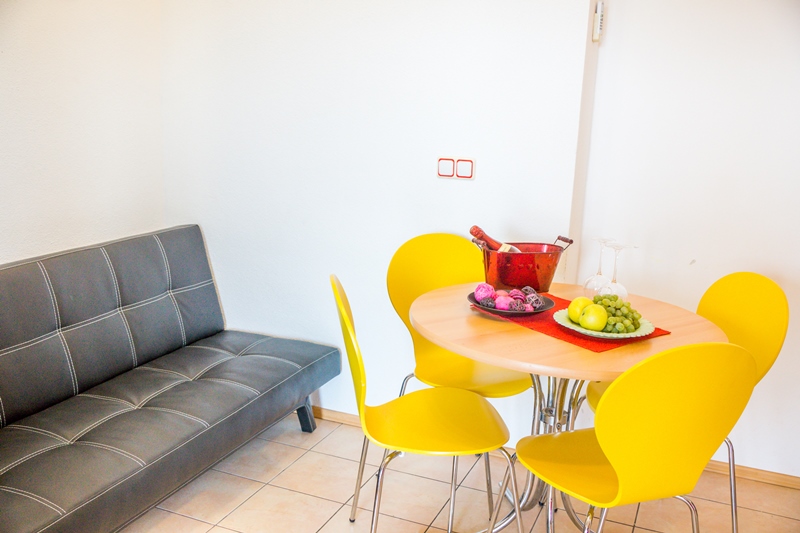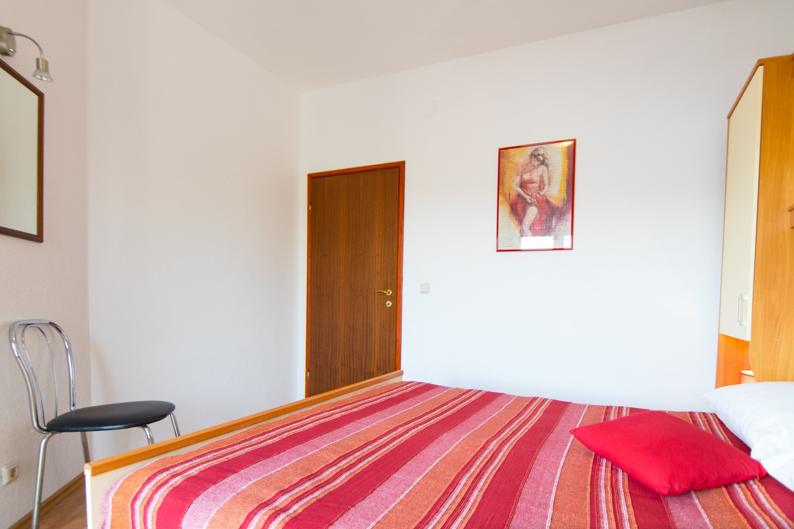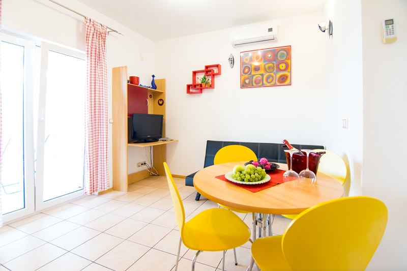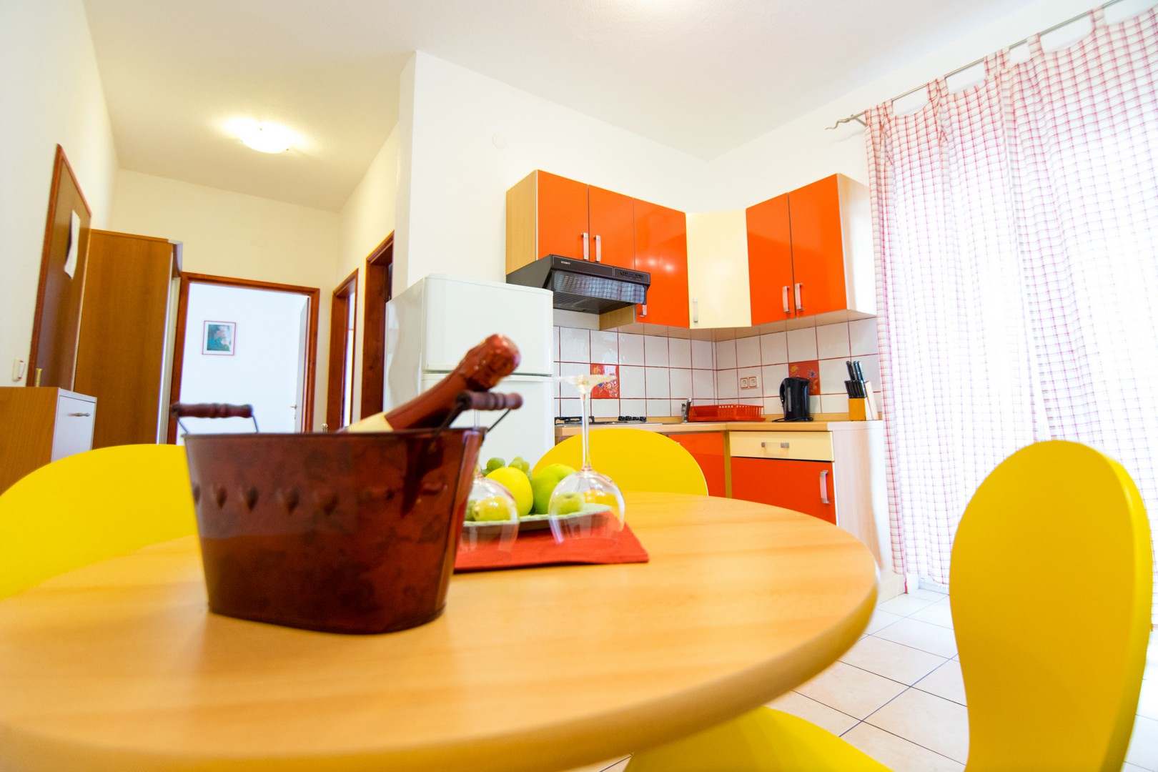 65m²; due camere da letto, una con letto matrimoniale e l'altra con due letti singoli che possono essere uniti a una grande; Cucina con zona pranzo e soggiorno con divano letto, bagno con WC, balcone, aria condizionata, TV satellitare, internet wireless, primo piano, parcheggio